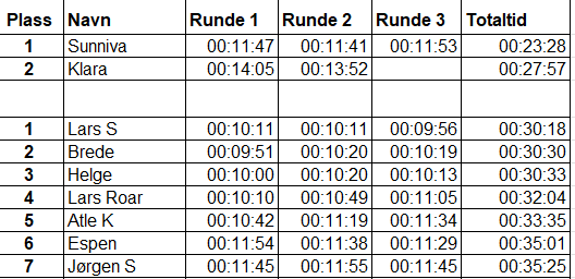 I dameklassen tok Sunniva seieren foran Klara. Blant herrene var Lars S raskest totalt – og spesielt mye raskere en diseltogene Brede og Helge på den siste runden – og ikke minst imponerende å kjøre med HT i denne løypa på dette føret.